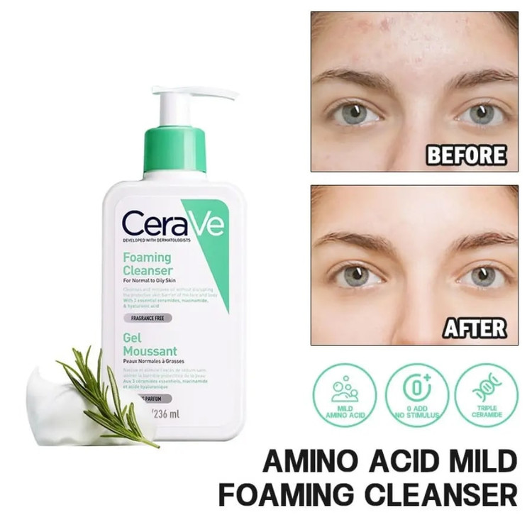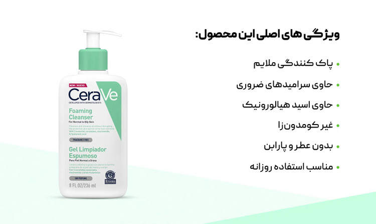 پاکسازی ملایم و موثر آلودگی، چربی، سبوم اضافی و ذرات مواد آرایشی آبرسان و مرطوب کننده برای جلوگیری از دهیدراته شدن پوست حاوی اسید هیالورونیک، سه نوع سرامید ضروری و نیاسینامید: 236میل